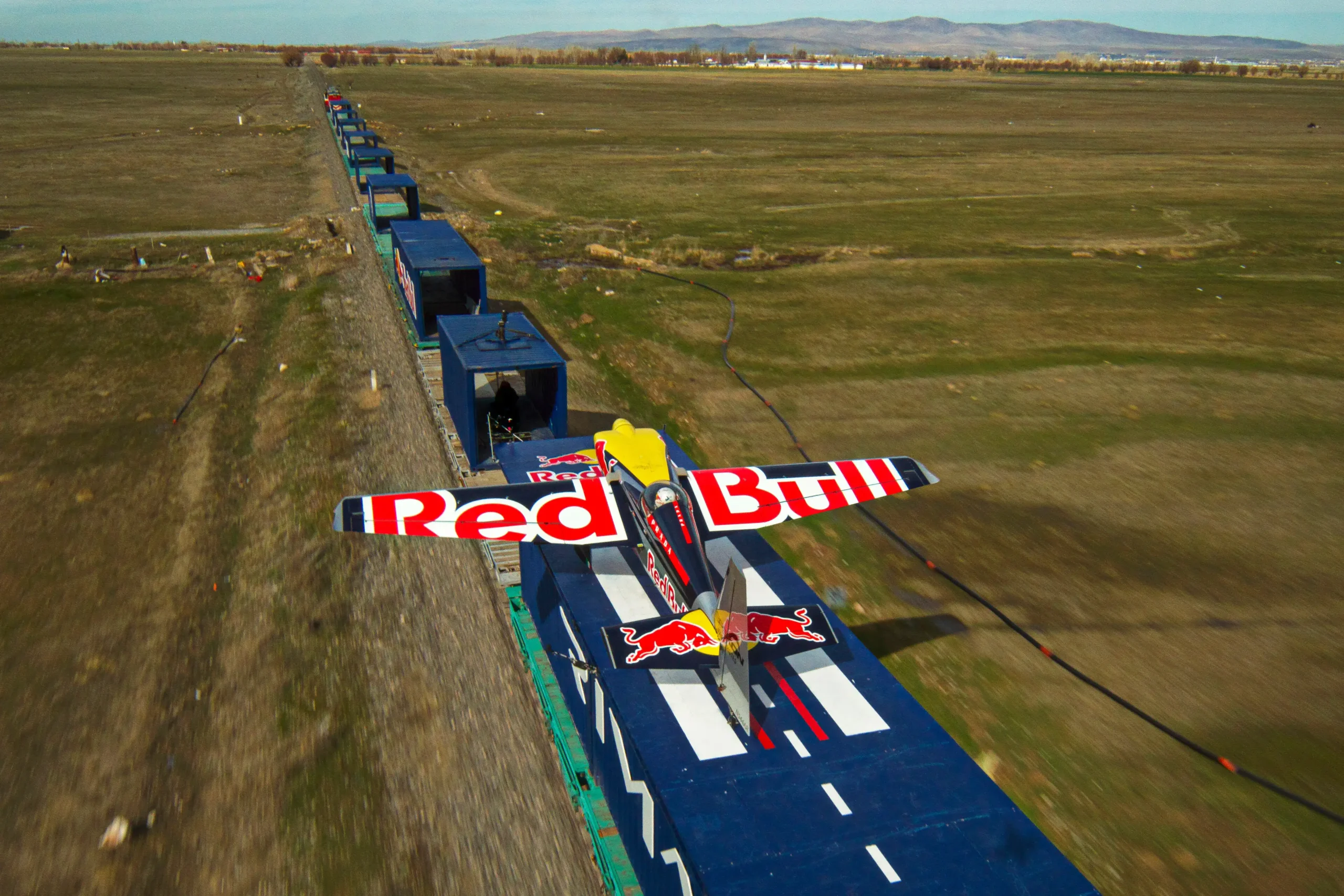 Red Bull pilot lands and takes off from a moving freight train in a precision aviation first.