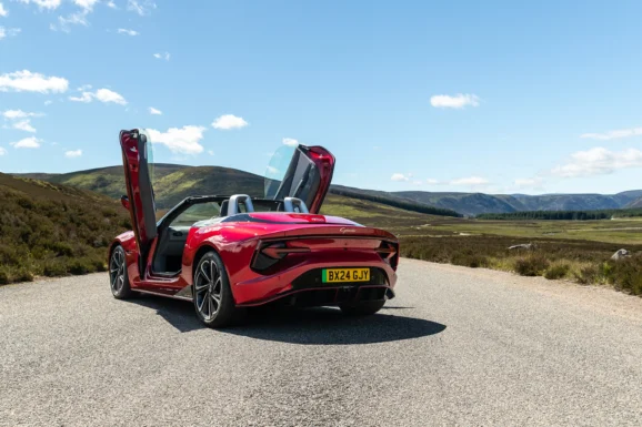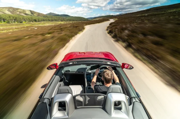 The cabin offers more room than most two-seat roadsters. Synthetic leather and suede-effect materials extend across the interior, and the heated seats provide six-way adjustment that supports longer journeys. A triple-screen driver layout forms the main interface. The underlying structure of the menus requires patience, and I spent time working through layers of functions before locating the settings I wanted. The portrait-style central touchscreen manages climate and audio, and I gained the impression that additional physical controls would support concentration. The paddles behind the steering wheel allow immediate adjustment of regenerative braking and power modes. An F1-style Super Sport button on the wheel provides direct access to maximum performance.