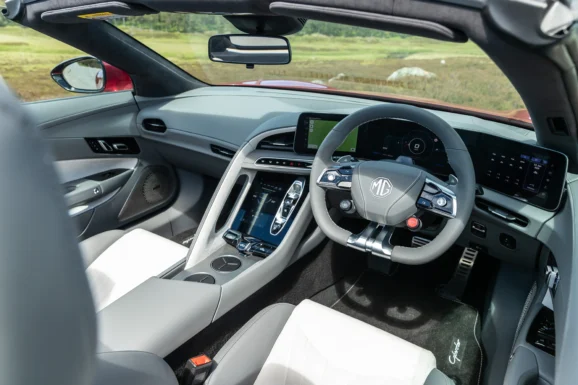 Roof-down driving forms a central part of the Cyberster’s appeal. The aerodynamic profile controls turbulence effectively, even at higher speeds, and the heated seats and strong heater maintain comfort during colder months. MG offers synthetic sound modes that mix modern EV tones with references to classic MG exhaust notes, and these add character when the roof is lowered. The Cyberster moves cleanly across varied surfaces, and the ride remains composed at speed. It retains elements of MGB charm through its sense of open-road engagement, although it operates with far greater capability and refinement due to its electric platform. The car enters a sector that includes the BMW Z4 and Porsche 718 Boxster and introduces an electric alternative with clear sporting intent.