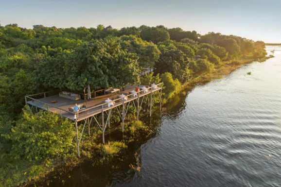 Chobe Game Lodge looks out across the Chobe River to the vast Caprivi floodplains. To the east, in Zimbabwe, there are the mighty Victoria Falls. In the distant north, the wilderness of Zambia; in the south-west, the savannah lands of the Kalahari Botswanan desert. Chobe National Park is home to elephants, buffalo, leopard and a wide variety of antelopes.