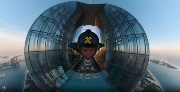 As they approached the tower, the team split formation. One flyer passed directly over the top of the structure, two tracked along its right and left sides, and the lead athlete flew through the hotel’s central architectural opening, known as the “Eye of the Needle”, before rejoining the group mid-air.