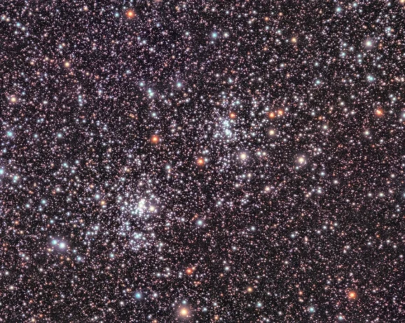 The Beehive Cluster contains over a thousand stars, lies in the faint constellation of Cancer, and is approximately 577 light-years away. It appears as a fuzzy patch between the Gemini and Leo constellations, roughly halfway along the line connecting the bright stars Pollux and Regulus. When viewed through binoculars or a telescope, dozens of stars can be resolved, revealing the “swarm” that gives the cluster its name, the “Beehive.”