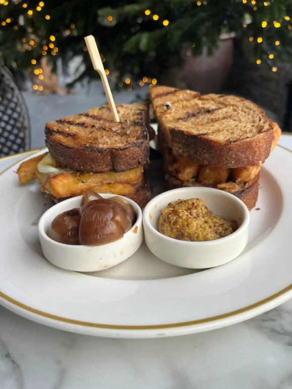 Back across the estuary in Rock, reached via the Black Tor Ferry, Paul Ainsworth’s pub The Mariners sits about half a mile south along the road. It serves exceptional pub food and is always busy, so booking is advisable. On this visit we sat outside under patio heaters overlooking the Camel River in late December and ate The Rock Chip Butty, made with triple cooked Yukon Gold chips, rye sourdough, Cornish vintage cheddar, Cornish Brie, aged parmesan and truffle mayonnaise.