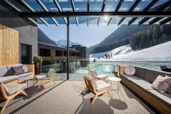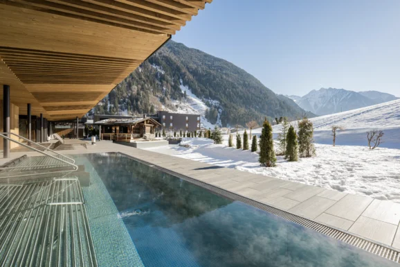 The Schwarzenstein is known as the region’s main wellness property for good reason. It boasts a 7,700 m² spa and wellness area, multiple indoor and outdoor pools, an adults-only Sky Spa, and a 23-metre rooftop infinity pool and one of the best spas in the world.