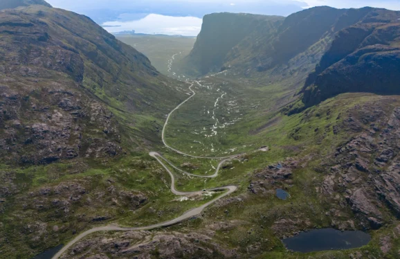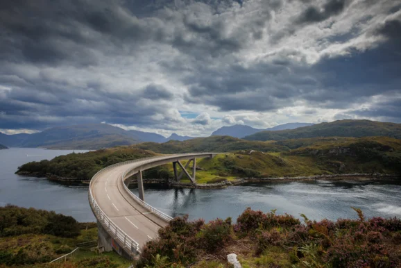The hamlet of Kylesku Bridge spans Loch a’ Chàirn Bhàin in a single elegant curve and has become one of the most photographed bridges in Scotland. From Kylesku, small boats run into Glen Coul, a sea-loch corridor enclosed by steep, roadless mountains. The silence, waterfalls and sheer rock faces make this one of the most remote-feeling coastal landscapes on the mainland and far more than a mere selfie photo op.