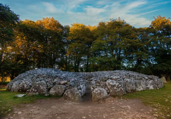 The Bronze Age cemetery at Clava Cairns dates to around 2000–1500 BC and includes passage graves, ring cairns and kerb stones marked with cup-and-ring carvings. The layout aligns with the midwinter sunset. The Bronze Age cemetery at Clava Cairns dates to around 2000–1500 BC and includes passage graves, ring cairns and kerb stones marked with cup-and-ring carvings. The layout aligns with the midwinter sunset. The site sits in light woodland a short distance from Inverness and is often visited by fans of Outlander because its Bronze Age stone circles closely resemble the fictional Craigh na Dun (although the series was filmed elsewhere).