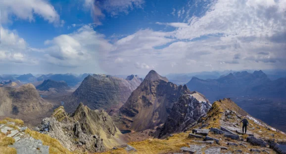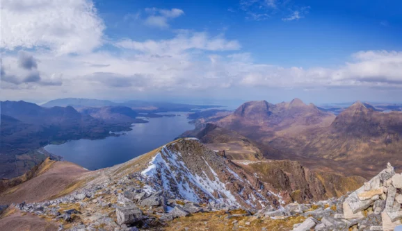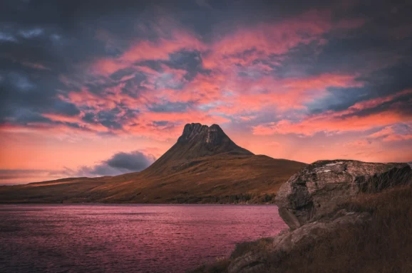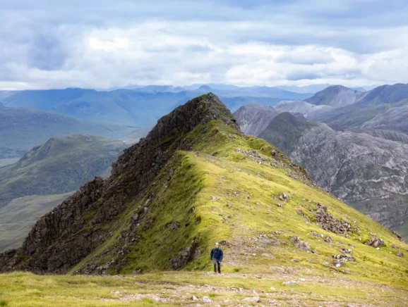 Beinn Bhan rises directly above the Applecross peninsula and offers one of the most dramatic sea-to-summit hikes in the region. The route traverses granite slabs and heather before opening to a broad summit plateau with views across Loch Torridon to Skye. Tucked into the high corries are small lochans and pale shingle margins sometimes described as a “mountain beach”. If a nervous drive over to Applecross isn’t your vibe, then a scenic walk over it just might be. Beinn Bhan is a picturesque hiking destination complete with its own mountain beach and loch for wild campers.